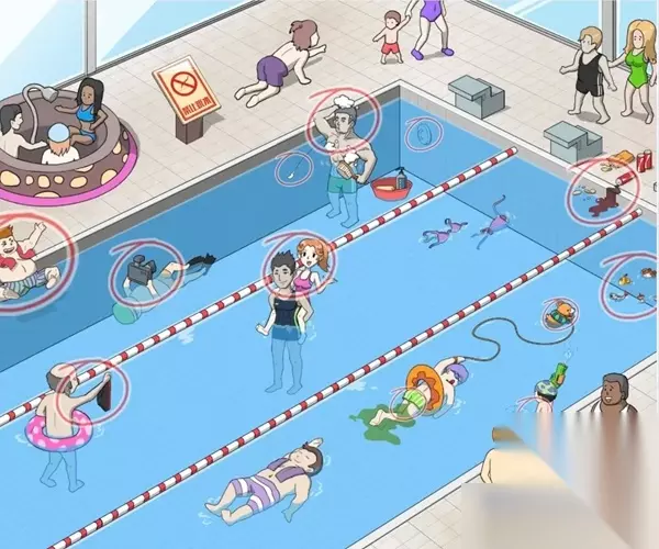 无限脑洞游戏是一款在抖音上非常好玩的休闲益智游戏,其中关卡花样泳池怎么过?这一关图中有找出泳池内十二个不文明的禁止事件,大家需要一一找出来。今天小编就给大家带来了详细的无限脑洞花样泳池通关攻略,需要的来看看吧,希望对大家有帮助! 无限脑洞花样泳池通关攻略 花样泳池十二个不文明的禁止事件答案: 禁止跳水找到跳水的胖子、在泳池中拿摄像机的、赤裸的大爷、在泳池中洗澡的、电线掉在泳池中、右边水闸开的、饮料喝薯片零食掉在水池里、柯基、水池中小便 依次点击如图中所画出的圈圈中的人,就可以过关。