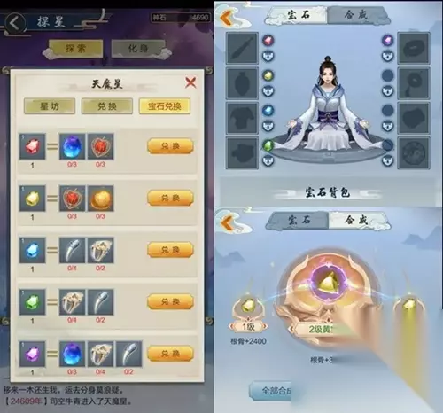 宝石玩法介绍: 在探星中收集到的材料,可以兑换宝石。不同的宝石对应不同的装备,还拥有自己的等级。 用来镶嵌在装备槽上,能让道友们实力倍增哦~另外,同样的宝石还可以进行合成,获得更高级的宝石,获得更多属性加成。