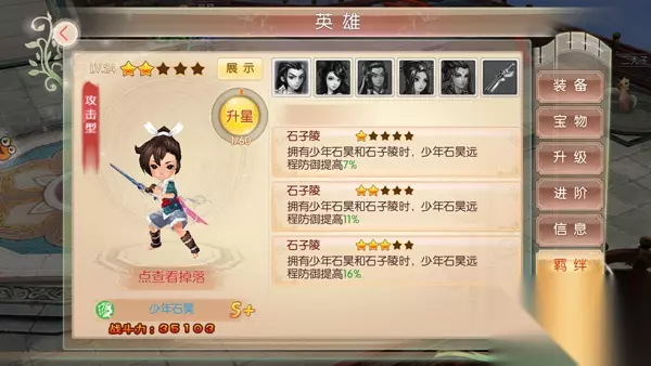 想要升星需要少年石昊碎片,碎片产出为招募、关卡掉落、商店购买等途径