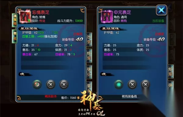 对于为穿戴在身上的装备,我们可以直接在背包中查询装备详情,点击装备后,页面左侧为未穿戴的装备,右侧则为已穿戴装备;我们看到左侧装备的右边会有“出售”两字,下方则显示该装备的出售价格,点击此按钮后装备会直接被售卖换成铜币,此时装备是无法找回的。为了减少更多损失,建议大家留着无用装备,可以将其放入“加工-分解”系统中生成碎铁。 图5:未穿戴装备(左)和已穿戴装备(右)对比