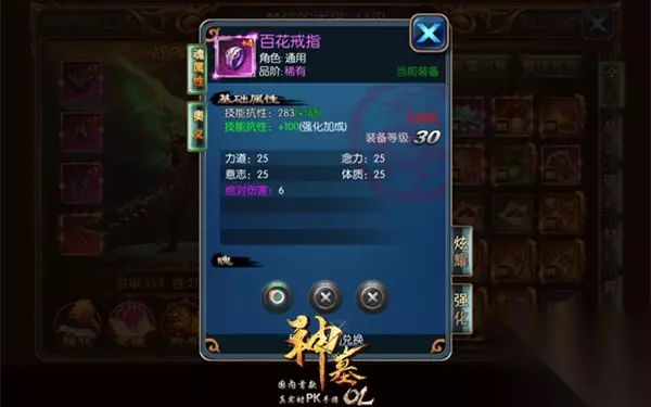 装备详情页详细地介绍了装备的各个属性加成,并且融入了可以进行操作的所有引导跳转。就拿目前的紫霄职业举例,“角色:紫霄”则表示该装备是的专属装备,若在角色后写明通用,则表示三种职业均可使用。 图2:点击身上已穿戴的装备可快捷进入部分强化系统