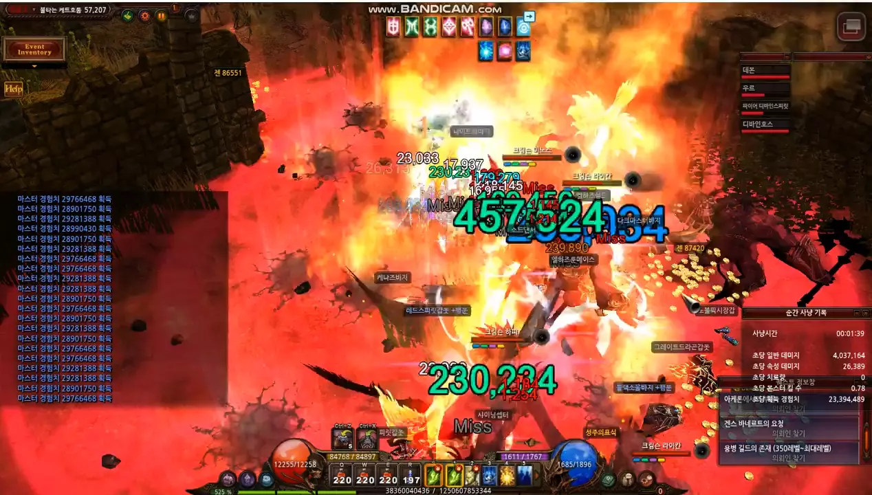 这是MU奇迹韩国服S21-2-1蓝区的弓手改版后测试内容,展示了弓手在战斗中的技能特效、伤害数值,以及战斗中获得经验、金币等收益的画面,呈现了改版后弓手的战斗表现。
