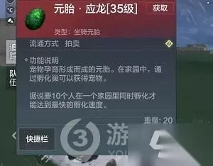 再点击孵化即会出现旅者拥有的所有异兽蛋。孵化应龙元胎即可。 孵化完成的宠物会自动进入骑宠或氏族页面。 四、注意事项 神兽图腾是一种特殊图腾需要提交巨兽试炼石开启。 需要在限时10分钟内击败才有击杀掉落。 元胎往往会对孵化温度有要求,左下角是当前温度,只有当前温度符合元胎孵化要求,孵化工作才能顺利进行。 如果旅者家园并不适宜孵化,可以去温度相对适宜的地方,找一户有孵化巢的玩家,借用他的孵化巢进行孵化。 以上就是妄想山海应龙获取攻略了,希望对大家有所帮助。