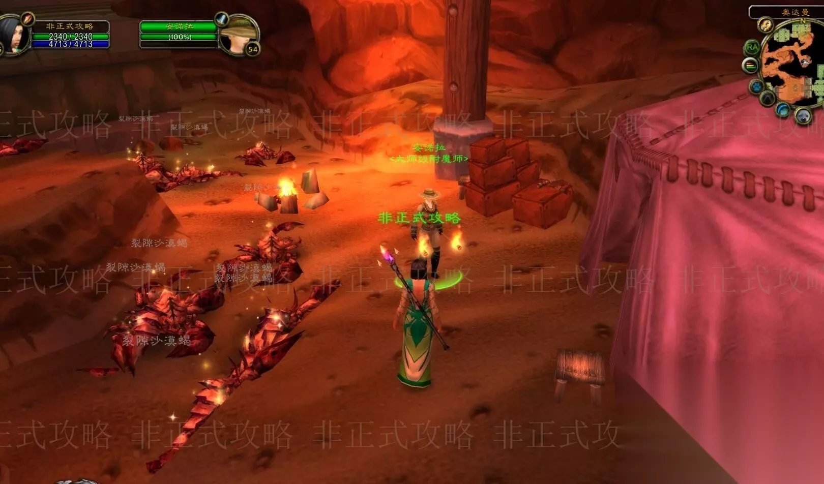 部落150之后的高级附魔训练师 150 – 151, *** 一个【符文金棒】,需要材料:金棒1,彩色珍珠1,强效星界精华2, 灵魂之尘2。 152~160,用【附魔护腕 – 次级耐力】冲,需要材料:9×灵魂之尘2。 161~165,用【附魔盾牌 – 次级耐力】冲,需要材料:5× (次级秘法精华1, 灵魂之尘1)。 166~180,用【附魔护腕 – 精神 】冲,需要材料:15×次级秘法精华1 。 181~200,用【附魔护腕 – 力量】冲,需要材料:20×幻象之尘1。 200~201, *** 一个【符文真银棒】,需要材料: 真银棒1,黑珍珠1, 强效秘法精华2, 幻象之尘2。 202~205,用【附魔护腕 – 力量 】冲,需要材料:4×幻象之尘1。 206~225,用【附魔披风 – 强效防御】冲,需要材料:20× 幻象之尘3。 冲到225,就要去找训练师提升技能到300了。 大师级附魔训练师,部落和联盟都要去奥达曼副本中去找安诺拉。从奥达曼后门去距离最近,进副本之后往右边走,来到这个帐篷前,这里需要清掉一群蝎子之后,安诺拉才会从阴影中走出来。 这个地方一个人单独进来只为学习附魔有些困难。所以为了避免来回奔波的麻烦,更好一次带齐所以冲技能的材料。这里更高可以冲到250点的魔化瑟银锭、魔化皮,要带尽可能多的材料和要附魔的道具(披风、手套、胸甲、护腕、盾牌等),争取一次学完。