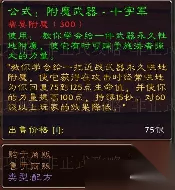 3、公式:附魔双手武器-超强冲击。这个由60+级的黑手精英掉落,掉率3.48%。