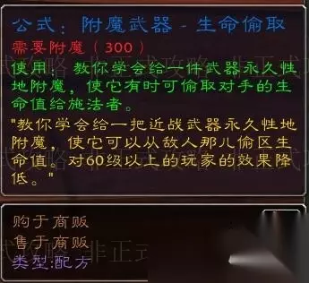 5、公式:附魔武器-生命偷取。这个由通灵学院的鬼灵研究员掉落,掉率0.88%。