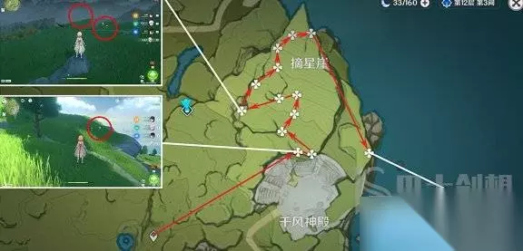 2、到达摘星崖这个位置之后向着千风神殿右上角的采集点进行前进,然后就可以在这里进行采集,接着就可以沿着标注点的位置;