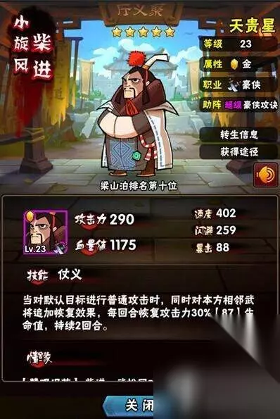 小传:大周皇帝的嫡系子孙,如假包换的皇亲贵族。喜欢结交江湖豪杰,仗义疏财。上梁山以后成为梁山的钱粮总管,排名第十位; 技能:【仗义】当对默认目标进行普通攻击时,同时对本方相邻武将施放恢复效果,每回合恢复攻击力30%生命值,持续2回合。 助阵技:超级豪侠攻诀:全体加巨量攻击,豪侠额外加成。 点评:全民水浒柴进的技能偏向于防御,可以给相邻的武将回复30%生命值,并且持续2回合,这个技能在初期十分的好用,前排配上一个带反击类技能的英雄十分好用,如果前排带上肉盾类,则会稍显爆发不够,很容易被对方打消耗;而柴进的助阵技则可以给队友加成巨量的攻击,对于小编这5个都是豪侠的阵容,当然十分喜爱柴进的助阵技啦。