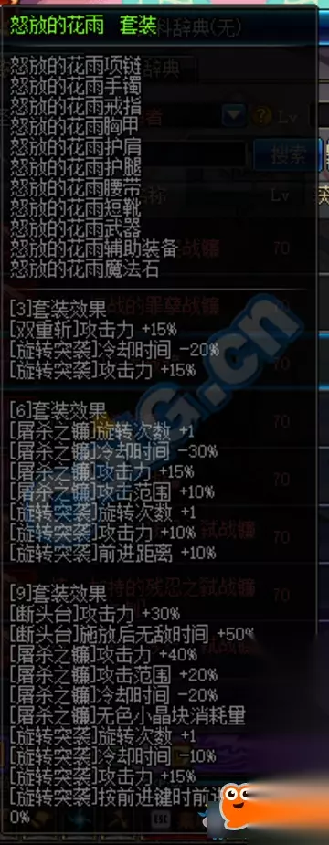 DNF怒放的花雨异界套属性介绍,怒放的花雨异界套是DNF为女圣职者带来的专属异界套。DNF怒放的花雨异界套属性好不好?下面就跟随小编一起来了解一下DNF怒放的花雨异界套的详细内容吧。 怒放的花雨异界套介绍 [3]套装效果 [双重斩]攻击力+15% [旋转突袭]冷却时间-20% [旋转突袭]攻击力+15% 6套装效果 [屠杀之镰]旋转次数+1 [屠杀之镰]冷却时间-30% [屠杀之镰]攻击力+15% [屠杀之镰]攻击范围+10% [旋转突袭]旋转次数+1 [旋转突袭]攻击力+10% [旋转突袭]前进距离+10% 9套装效果 [断头台]攻击力+30% [断头台]施放后无敌时间+50% [屠杀之镰]攻击力+40% [屠杀之镰]攻击范围+20% [屠杀之镰]冷却时间-20% [屠杀之镰]无色小晶块消耗里+1 [旋转突袭]旋转次数+1 [旋转突袭]冷却时间一10% [旋转突袭]攻击力+15% [旋转突袭]按前进键时前进距离+10%