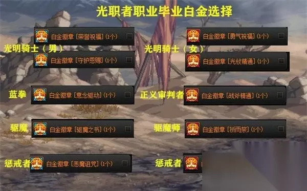 六、光职者 1、男光职者 辅助路线“荣誉祝福” 审判路线金“勇气恩赐” 蓝拳“意念驱动” 驱魔师“驱魔之书” 惩戒者“恶魔诅咒”。 2、女光职者 光明骑士辅助“勇气祝福” 审判“光杖精通” 正义审判者“战斧精通” 驱魔师“祈雨祭” 除恶者“罪业诱惑”