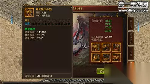 【尊武凌天靴子】 类型:靴子 条件:8转战士 基础属性:物理防御120-240;魔法防御130-310;物理攻击65-70 该装备可注灵 【尊武凌天手镯】 类型:手镯 条件:8转战士 基础属性:物理防御40-120;魔法防御45-155;物理攻击175-325 该装备可注灵 【尊武凌天项链】 类型:项链 条件:8转战士 基础属性:物理攻击265-490 该装备可注灵 【尊武凌天腰带】 类型:腰带 条件:8转战士 基础属性:物理防御120-240;魔法防御130-310;物理攻击65-70 该装备可注灵 220级禁地魔王死亡后会按伤害量排名奖励禁地卡片: 第1名奖励3张禁地金卡; 第2名奖励2张禁地金卡; 第3名奖励1张禁地金卡; 第4-10名奖励2张禁地银卡; 第11-20名奖励1张禁地铜卡; 第21及以后奖励1张禁地铁卡。