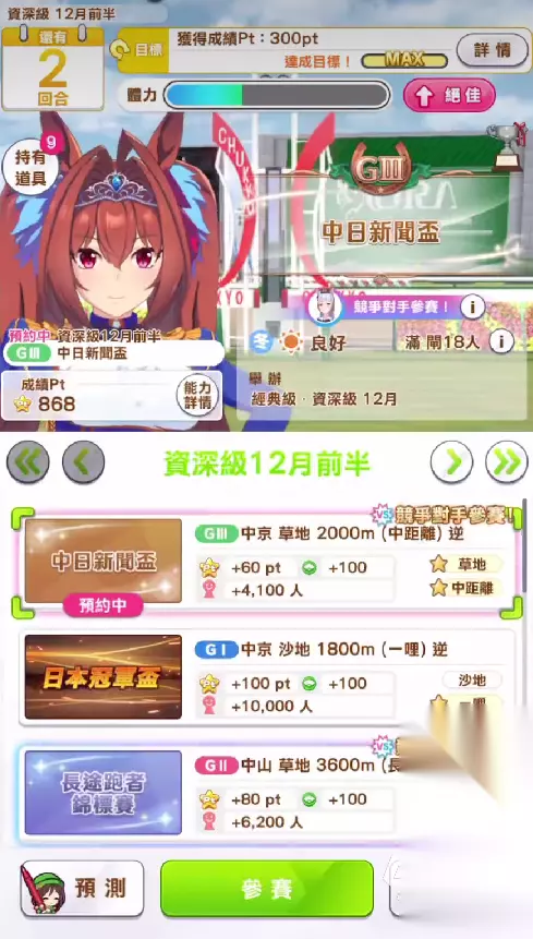 支援卡选择方面,建议玩家们以常用的三速两智一友人的配比进行选择。这种配置在前期阶段算是一个非常主流的通用配置了,刚好对于大和来说完全够用。特别是角色本身还需要跑英里赛,额外的速度配卡就显得异常的强势。并且整个培育目标当中几乎没有长距离比赛,因此,玩家们也不用过于纠结关于耐力方面的问题。只要智力充足,且PT点数足够,靠技能就可以很好的弥补这一点。