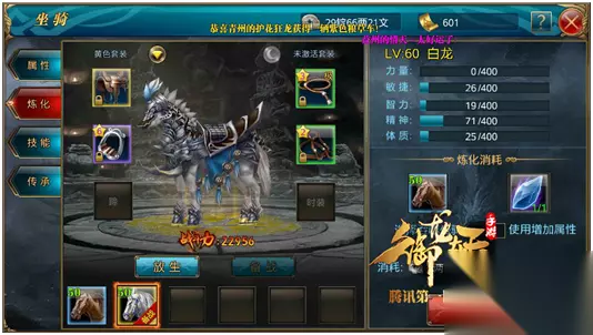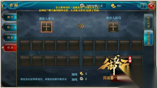 4.传承 在坐骑传承中分为两个部分,第一个部分为属性的传承,即炼化好的马匹需要更换的时候,点击属性传承可将之前炼化好的属性移到新的马匹上;在技能传承上,可放入带有学好的技能的老马,点击传承之后会将所学的技能传承给新马,怎么样很人性化有没有,再也不用多浪费技能书了。