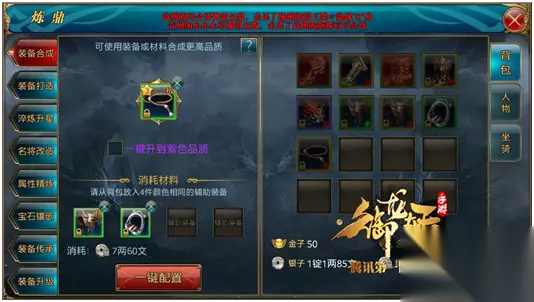 二、坐骑装备 1.装备合成 坐骑装备也同人物装备一样,可以通过消耗道具一键升为紫色装备,也可以通过消耗四件同等颜色的装备来几率提升颜色品质,不过从绿装合成到紫装还是有一定难度的,不如直接用道具一键到紫来的快。
