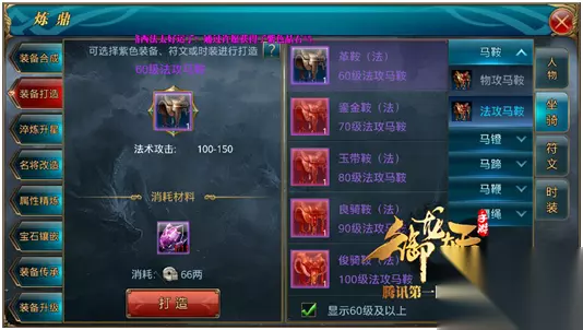 2.装备打造 同人物装备一样,马的装备也可以消耗材料来合成注意的是有物攻跟法攻,大家要选择适合自己职业的装备来打造。