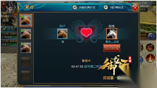 亲爱的小伙伴们,人物装备提升完毕你的战斗力提升了多少呢?当然《御龙在天手游》的装备提升远不止于次,那么今天小编将为大家带来坐骑装备、坐骑品质的提升,准备好了吗?一起随我来看下。 一、坐骑提升 1.属性提升 坐骑可以通过繁育功能生出二代马,二代马的品级也是紫色>绿色>黄色>蓝色>白色,并且系统会匹配神秘马,还可与繁育的二代马的人加为好友。