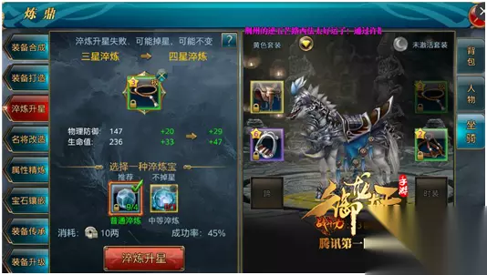 3.淬炼升星 《御龙在天手游》马装的淬炼升星和服饰装备是一样的,消耗马匹淬炼宝石来升星,升级失败有可能不变有可能掉星,这个和端游还是有一定区别的。