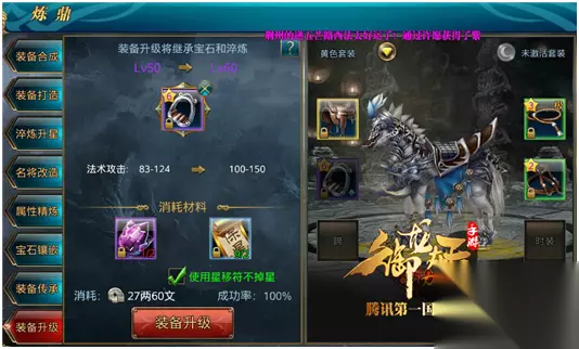 5.装备升级 在《御龙在天手游》里,马匹装备一样可以升级,不过只有紫装可以直接升级,并且6星以上的装备升级需要消耗星移符才能保证不掉星。