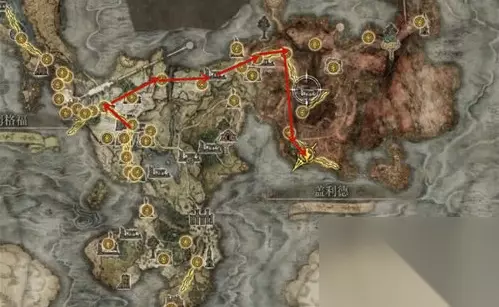 以关卡前废墟为起点,到龙飨教堂的路线图如下。