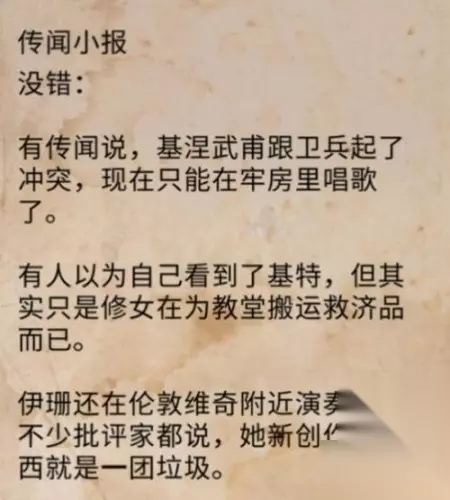 《刺客信条:英灵殿》伦敦神秘传说任务怎么做 问题描述: 按照上面说的找三个人,但是没找到对应的人,都在哪个位置可以找到啊? 任务攻略: 传说找3个人,一个在教堂前面一个凳子上 要帮她还50(圣保罗教堂附近一个凳子上); 一个在一个城外桥边上,在左边城门口的桥边上,你到附近就可以听见她在说话; 一个在要塞里面被关需要杀边上一个带钥匙的。 伦敦中心的传说需要回领地建造一个博物馆,才能开启后续任务。