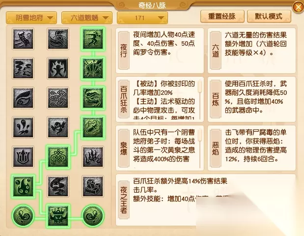 以力量为主的阴曹地府地府玩家任务流派推荐选择【六道魍魉】,推荐采用“3333212”的点法。该法流派不仅可以通过【夜行】和【夜之王者】在夜晚获得极高的伤害加成,还能靠着【百爪狂杀】、【百炼】和【六道】提升输出效果,配合新改动的“真陀护法”卡可以获得相当不错的伤害加成。 【挑战模式及PVP】流派经脉推荐