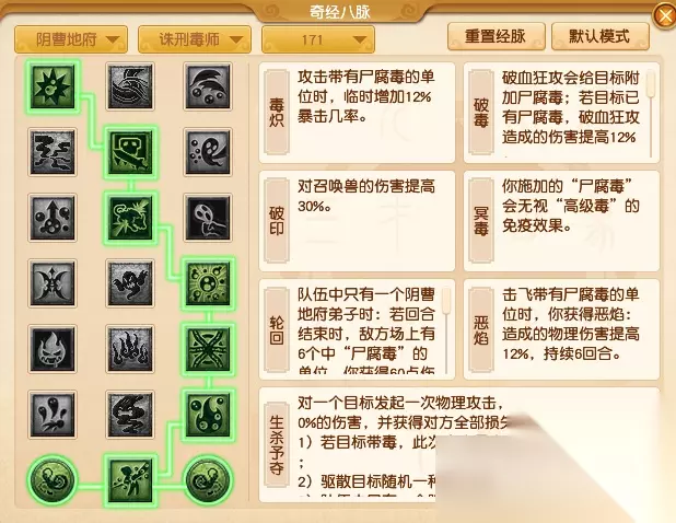 【诛刑毒师】流派属于较为冷门的经脉,要想发挥出该流派的伤害能力,需要侧重“尸腐毒”状态,所以建议采用“1223332”的点法。这样的点法搭配破血狂攻后,可以拥有相当不错的清宠能力,当敌方场上尸腐毒单位较多时还能提升自身属性。除此之外,大招“生杀予夺”的输出能力也相当不错。