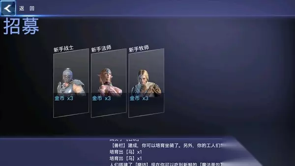 到这里设施也建造的比较多了,我们此时可以招募英雄啦,前期招募每一个英雄需要3金币,我们出去把金币准备好,然后回来招募英雄吧!可以招募的英雄有:新手战士、法师、牧师、盗贼、猎人,小编是每一个都招募了,不过前期探险只能使用3个英雄,这个就看大家选择啦。