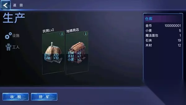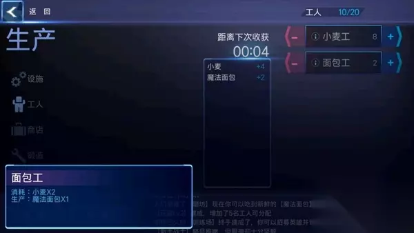 工人怎么分配呢? 起初只有小麦工和面包工,一个工人只能生产其中一样物品,1个面包需要2个小麦来制作,面包主要是后面作为英雄冒险远征的食材,后续我们会得到更多的设施,就需要及时把工人分配出去,等待时间之后就可以采集更多材料了。 接下来什么都不用想,不停建造设施即可,材料不够的话工人制作制作后可以收税,还有可以去商店购买,金币随意加点。 设施建造顺序就跟着系统来:民房-地精商店-兽栏-磨坊-训练场-旅馆。
