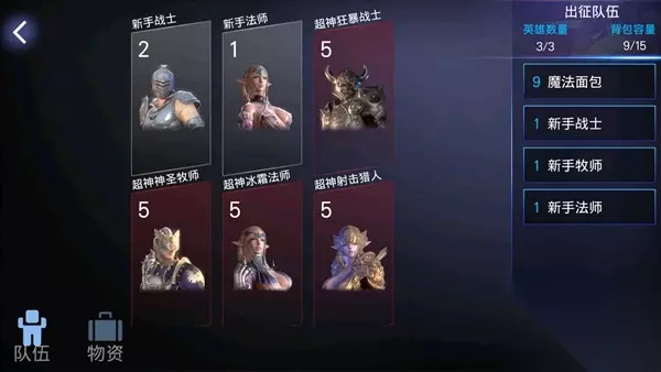得到了英雄我们就可以远征冒险啦!返回主界面进入探险,小编选择的是战士、牧师和猎人阵容,远征会遇到敌人哦!安排阵容中小编觉得必有牧师来补血,提高生存能力。