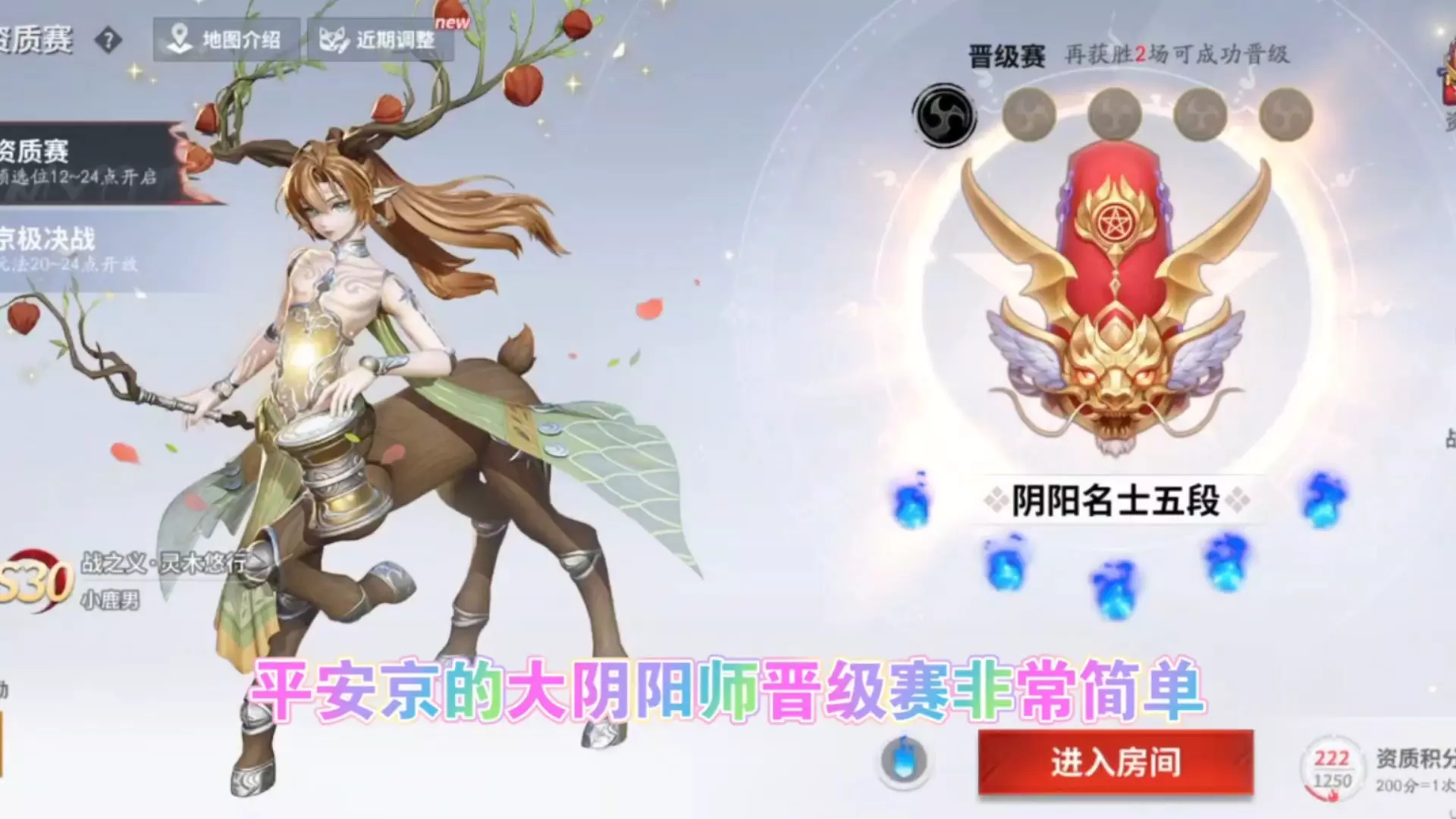 这是《决战平安京》的晋级赛游戏内容,玩家处于阴阳名士五段,再胜1场即可晋级,视频展示了选将、对局中抓敌、清兵线等操作过程,还对队友操作表示疑惑。