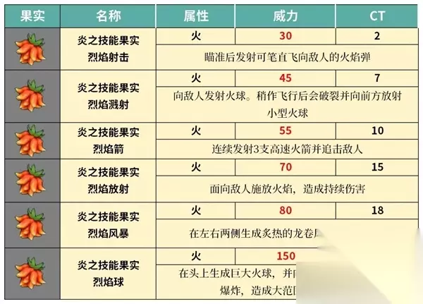 四、帕鲁光束 威力:150 CT:55 积蓄破坏性的能量,朝前方大范围射出威力惊人的光束 五、自爆 威力:180 CT:55 赌上性命引发大爆炸。使用后自身无法战斗六、超自爆 威力:250 CT:55赌上性命引发大爆,使用后便会化作,夜空中闪耀的明星。 幻兽帕鲁炎属性果实技能一览 一、烈焰射击 威力:30 CT:2 瞄准后发射可笔直飞向敌人的火焰弹 二、烈焰溅射 威力:45 CT:7 向敌人发射火球,稍作飞行后会破裂并向前方放射小型火球 三、烈焰箭 威力:70 CT:10 连续发射3支高速火箭并追击敌人