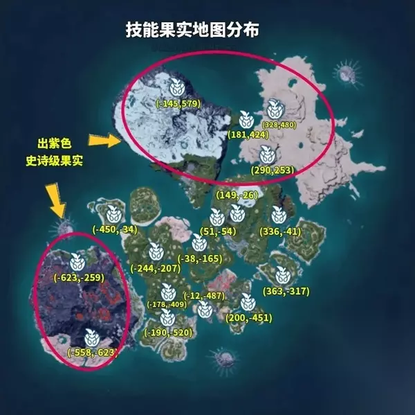 幻兽帕鲁技能果实树位置大全 如图所示位置:
