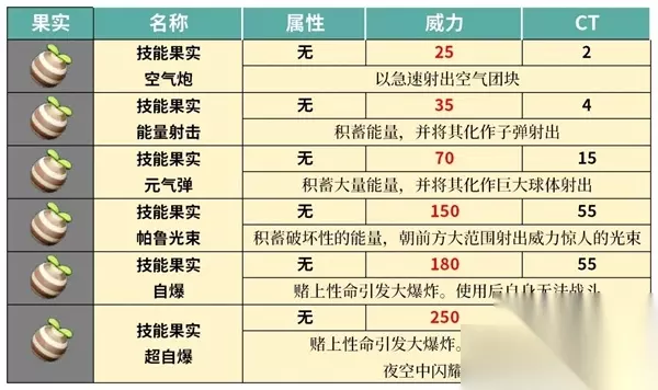 幻兽帕鲁无属性果实技能一览 一、空气炮 威力:25 CT:2 以急速射出空气团块 二、能量射击 威力:35 CT:4 积蓄能量,并将其化作子弹射出 三、元气弹 威力:70 CT:15 积蓄大量能量,并将其化作巨大球体射出