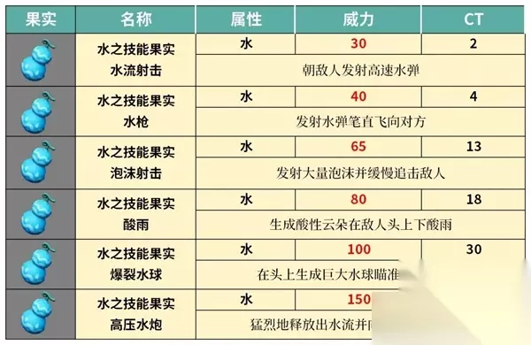 四、烈焰放射 威力:70 CT:15 面向敌人施放火焰,造成持续伤害 五、烈焰风暴 威力:80 CT:18 在左右两侧生成炙热的龙卷风,并扇向敌人六、烈焰球 威力:150 CT:55 在头上生成巨大火球,并向敌人发射,中弹后会爆炸,造成大范围爆炸冲击波。 幻兽帕鲁水属性果实技能一览 一、水流射击 威力:30 CT:2 朝敌人发射高速水弹 二、水枪 威力:40 CT:4 发射水弹笔直飞向对方 三、泡沫射击 威力:65 CT:13 发射大量泡沫并缓慢追击敌人