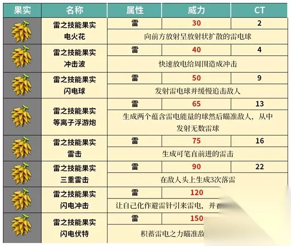 四、酸雨 威力:80 CT:18 生成酸性云朵在敌人头上下酸雨 五、爆裂水球 威力:100 CT:30 在头上生成巨大水球瞄准敌人并发射六、高压水炮 威力:150 CT:55 猛烈地释放出水流并向前方大范围横扫 幻兽帕鲁雷属性果实技能一览 一、电火花 威力:30 CT:2 向前方放射呈放射状扩散的雷电球 二、冲击波 威力:40 CT:4 快速放电给周围造成冲击 三、闪电球 威力:50 CT:9 发射雷电球并缓慢追击敌人