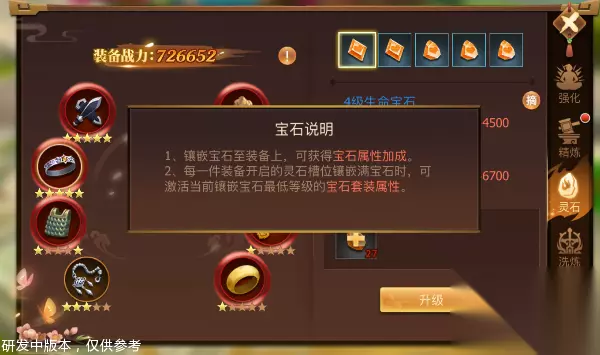 3.宝石属性加成和套装效果 点击战力右边的叹号,就会弹出宝石说明,镶嵌宝石就可以获得宝石的属性加成。