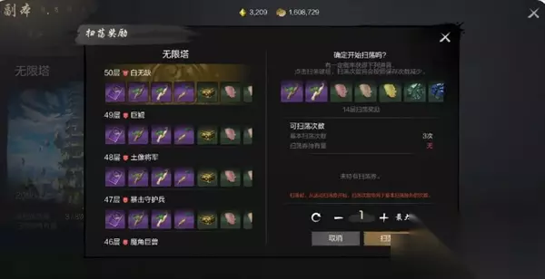 如果玩家已经通关全部层数的无限塔,或暂时打不过更高层的无限塔,还可以通过扫荡功能来获取额外的资源。灵芝可以对已经通关的楼层进行扫荡,楼层越高,扫荡可获得的奖励越丰厚,每天4点会补充1次扫荡次数,最多累积3次,灵芝们别忘了每天都要扫荡一下哦~