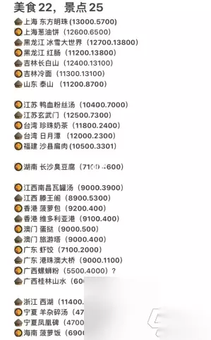 羊了个羊景点美食坐标大全 详细坐标: 北京市 (7800,11400) 北京烤鸭 北京市 (8600,10900) 天坛 上海市 (13000,5700) 东方明珠塔 上海市(12600,6500)葱油饼 江苏省 (12500,7000) 玄武门 上海 重庆市 (6100,4700) 洪崖洞 重庆市 (5800,6300) 重庆火锅 天津市 (10400,10700) 天津之眼 天津市(9600,10800)煎饼果子 福建省 (10500,3300)沙县扁肉 贵州省 (5900,4100)酸汤鱼 贵州省 (6100,3700) 黄果树瀑布 湖北省 (6100,7300)热干面 湖北省(7500,5900)黄鹤楼 陕西省(5500,9000) 秦兵马俑 河南省 (7700,7800) 清明上河园 河南省(6800,8700)胡辣汤 山西省(6500,11300)刀削面 山西省(6400,9900)平遥古城 江西省(8900,5300)滕王阁 江西省(9000,3900)瓦罐汤 湖南省(7100,4600)臭豆腐 浙江省(11400,4000)西湖 台湾省(11800,2400)珍珠奶茶 台湾省(12000,2300)日月潭 广东省(9000,1100)港珠澳大桥 广东省(7100,2000)虾饺 海南省(6900,300)海南菠萝饭 海南省(7700,400)鹿回头风景区 黑龙江省(12700,13800)冰雪大世界 黑龙江省(11200,13800)哈尔滨大红肠 宁夏回族自治区(4700,12100)羊杂碎汤 河北省(8400,9800)驴肉火烧 河北省(8200,12200)山海关 广西区(5500,4000)螺蛳粉 贵州省 安徽省(9100,6200)黄山 福建省(11200,2100)太姥山 福建省 (10500,3300)沙县扁肉 贵州省 (5900,4100)酸汤鱼 贵州省 (6100,3700) 黄果树瀑布 贵州省(5500,3600)酸汤蹄花 湖北省 (6100,7300)热干面 湖北省(7500,5900)黄鹤楼 陕西省(5500,9000) 秦兵马俑 陕西省(5600,11900)肉夹馍 河南省 (7700,7800) 清明上河园 河南省(6800,8700)胡辣汤 山西省(6500,11300)刀削面 山西省(6400,9900)平遥观风楼 江西省(8900,5300)滕王阁 江西省(9000,3900)瓦罐汤 湖南省(7100,4600)臭豆腐 湖南省(7800,3900)岳阳楼 浙江省(11400,4400)西湖 浙江省(10300,5500)金华火腿 台湾省(11800,2400)珍珠奶茶 台湾省(12000,2300)日月潭 广东省(9000,1100)港珠澳大桥 广东省(7100,2000)虾饺 广东起点书城(9300,2600) 香港(9100,400)维多利港 香港(9200,400)菠萝包 澳门(9000,500)葡挞 澳门(9000,400)旅游塔 海南省(6900,300)海南菠萝饭 海南省(7700,400)鹿回头风景区 黑龙江省(12700,13800)冰雪大世界 黑龙江省(11200,13800)哈大红肠 宁夏区(4700,12100)羊杂碎汤 宁夏区(4700,10800)凤凰碑 河北省(8400,9800)驴肉火烧 河北省(8200,12200)山海关 四川省(4500,5500)杜甫草堂 四川省(3600,7200)麻婆豆腐 山东省(11200,8700)泰山 山东省(9200,8800)煎饼卷大葱 吉林省 (11300,13100) 延边冷面 吉林省 (12400,13100) 长白山天池