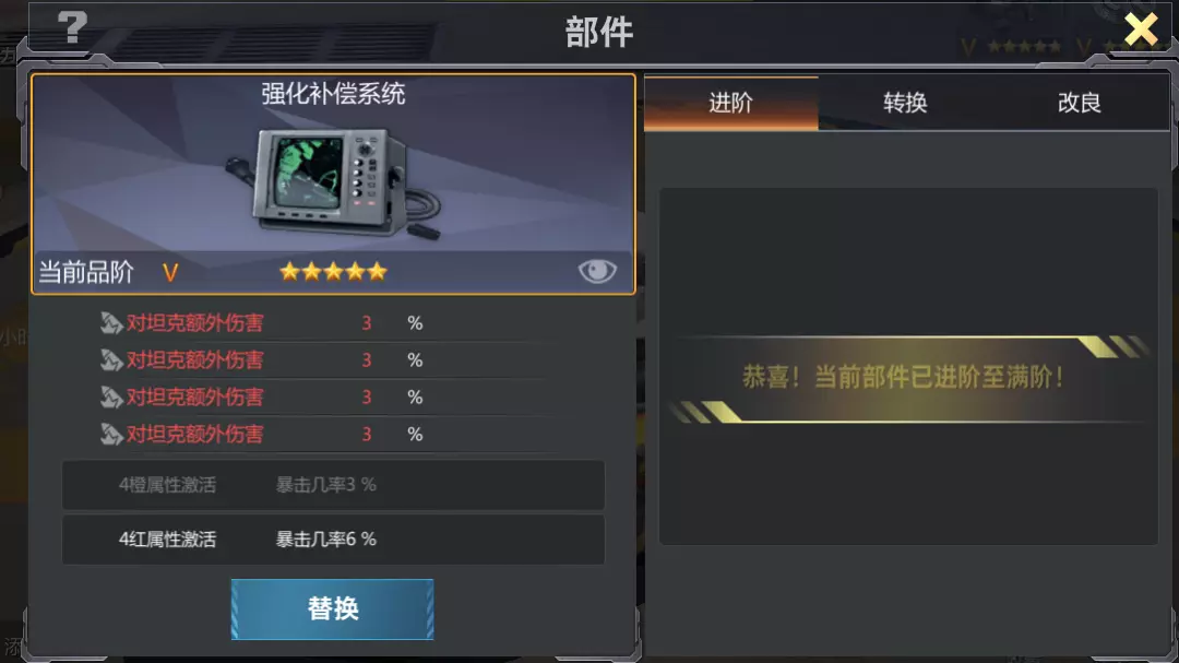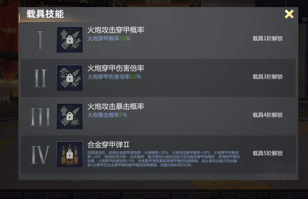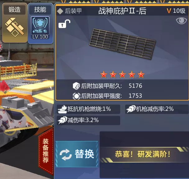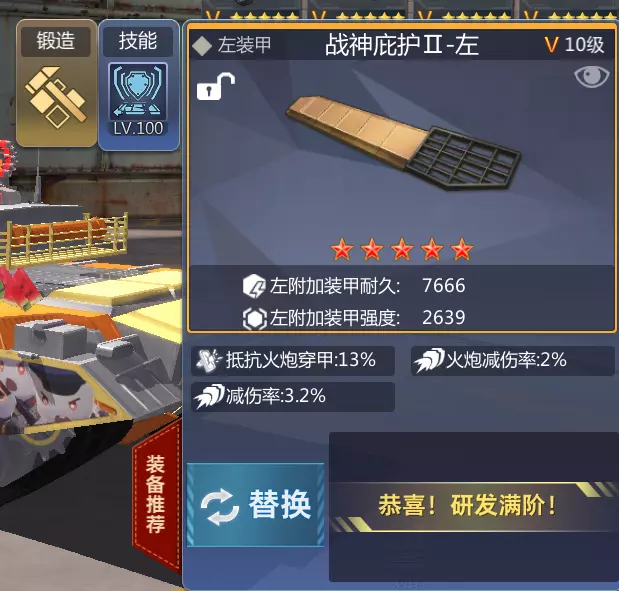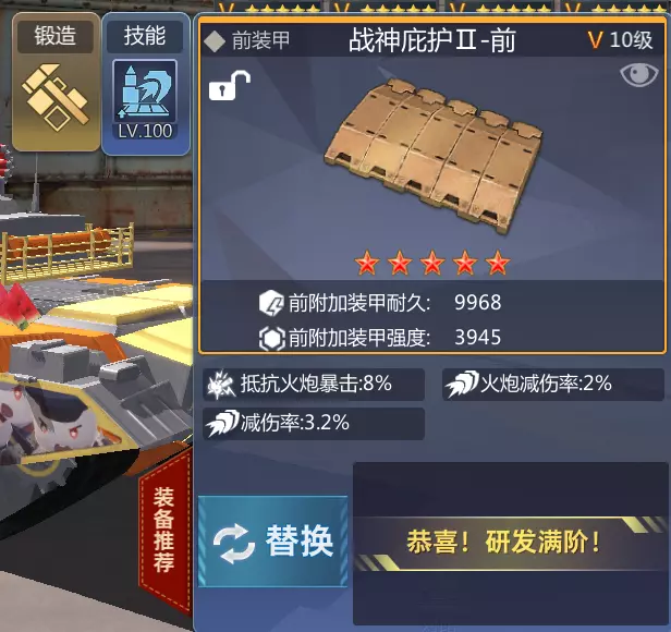 图上所述前甲,改造技能为火炮减伤,锻造技能建议4前装甲强度。