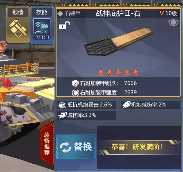 既然2块甲都主防御坦克了那么防御机炮进攻的甲咱们也不能落下,右甲我选择的为改造技能为装甲军团,建议各位指挥官选择不灭,锻造属性为4侧装甲强度。