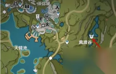 1、玩家登录游戏后,先打开地图,找到【须弥城】。 2、然后在须弥城的右下方找到【离渡谷】,传送到距离渡谷最近的锚点,这边小编建议玩家选择离渡谷右下方的那个锚点。
