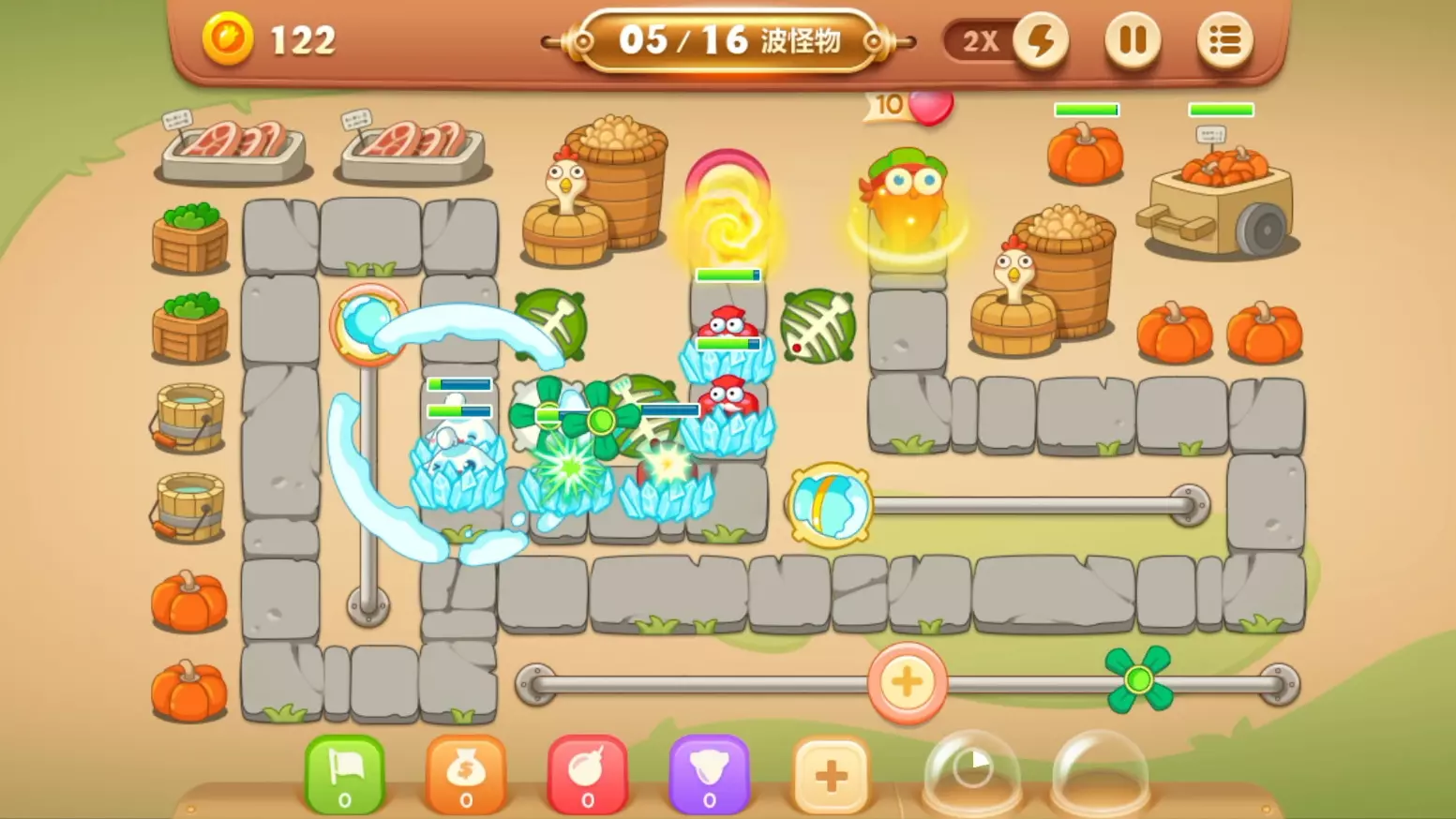 这是《保卫萝卜》沙漠主题的关卡挑战,玩家布置火箭炮塔等防御设施,正对抗多波怪物,该关卡共20波怪物,过程紧张刺激,是既爽快又极限的闯关过程。