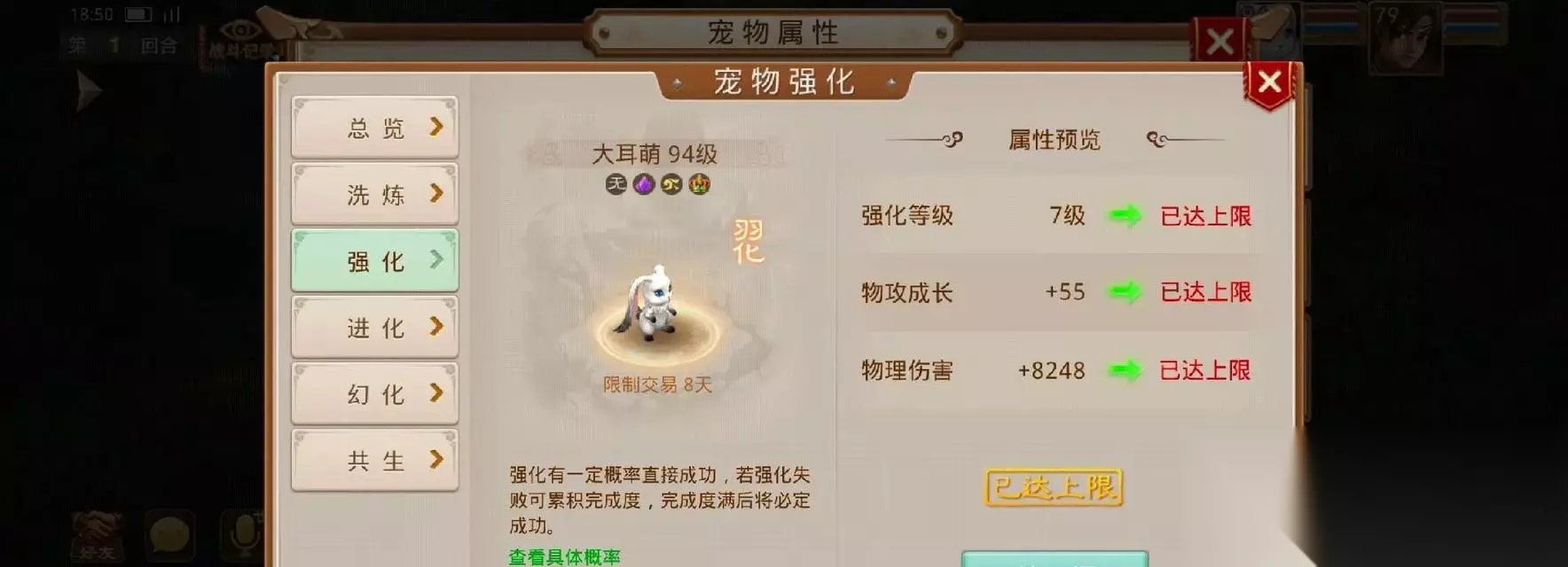 问道手游宝宝强化进阶攻略大全详尽解析 1、强满不点化电精的成长为70+60=130点。雷怪强满不点化的成长是80+54=134点。法宠的强化上限就是135, 基…