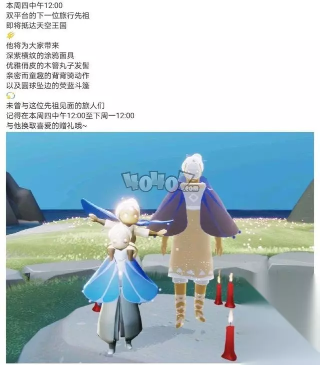 之前关于3月11日的复刻先祖一直都是争论不休,很多玩家都进行了预测,有的人认为是上个季节唯一没有复刻的飞鸟先祖,但是今天中午十二点的时候,光遇官方发表文章表示这次3月11日复刻的先祖是二级背背先祖。 相信很多人都没有预料到是这个先祖,我们可以在二级背背先祖兑换到二级背背动作,二级背背动作就是在一级的基础上,背上的小人能够张开双手撑飞机,具体的动作如图所示,非常可爱的一个动作。 除了特定的动作以外,我们还可以背背先祖这里兑换到斗篷,面具和发型的奖励,斗篷的下方有着灯笼,但是这些灯笼不发光。