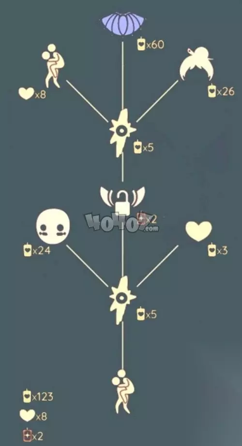 从上图可以看出来,我们如果想要兑换所有物品的话,一共是需要128根白蜡烛,2根升华蜡烛,8个爱心,如果单单想要兑换斗篷的话,只需要70个白蜡烛,2个升华蜡烛,如果单单想要兑换二级背背动作的话,是需要10个白蜡烛,2个升华蜡烛,8个爱心,发型则是36个白蜡烛,2个升华蜡烛,面具是29个白蜡烛。 如果你喜欢这些东西的其中一个甚至是全部的话,那么可以从现在开始攒蜡烛了,这次复刻的背背先祖将于3月11日中午十二点降临,截止到下周一的中午十二点,提前攒够蜡烛之后方便我们立马兑换想要的奖励。