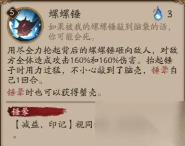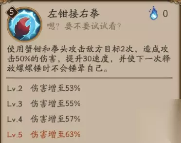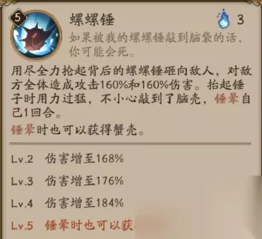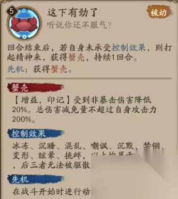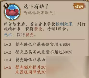 技能: 技能分析(By 鸽海成路): 新SR式神蟹姬技能解读:大招满级伤害184%x2,总计368%的aoe伤害。 对的,你没看错,aoe伤害,这下有劲儿了。 被动是降低非暴击伤害,和化鲸久次良反着来。 悄咪咪问一下,你们说的这个蟹姬,她动画快吗?快的话那岂不是魂十一女王了