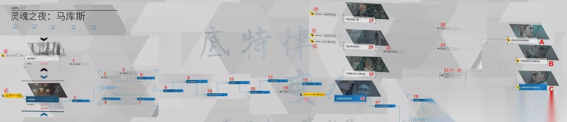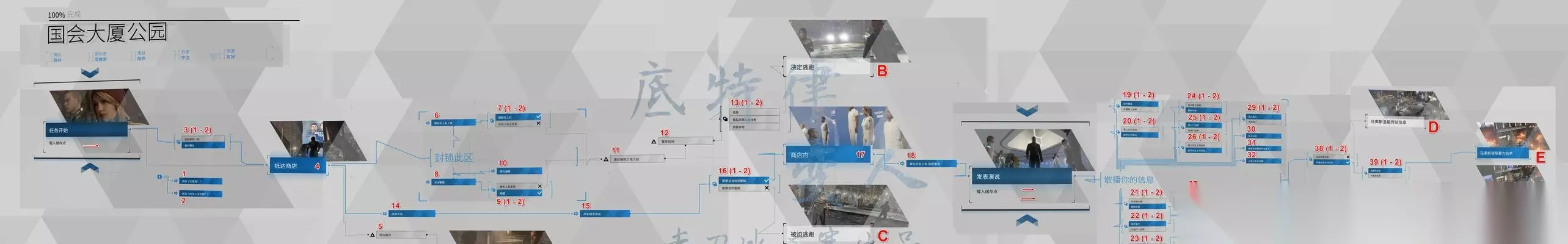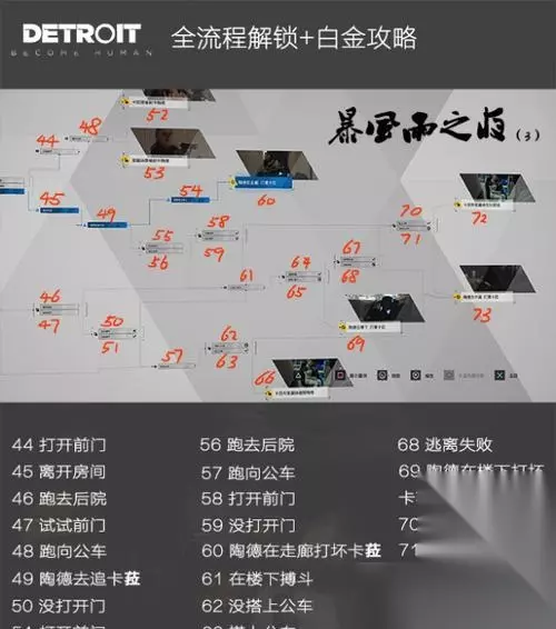 第一部分:主线任务1-安迪的选择 第二部分:支线任务1-底特律广场的暴力事件 第三部分:主线任务2-应对警察追捕 第四部分:支线任务2-红酒店的谜团 第五部分:主线任务3-大楼劫持事件