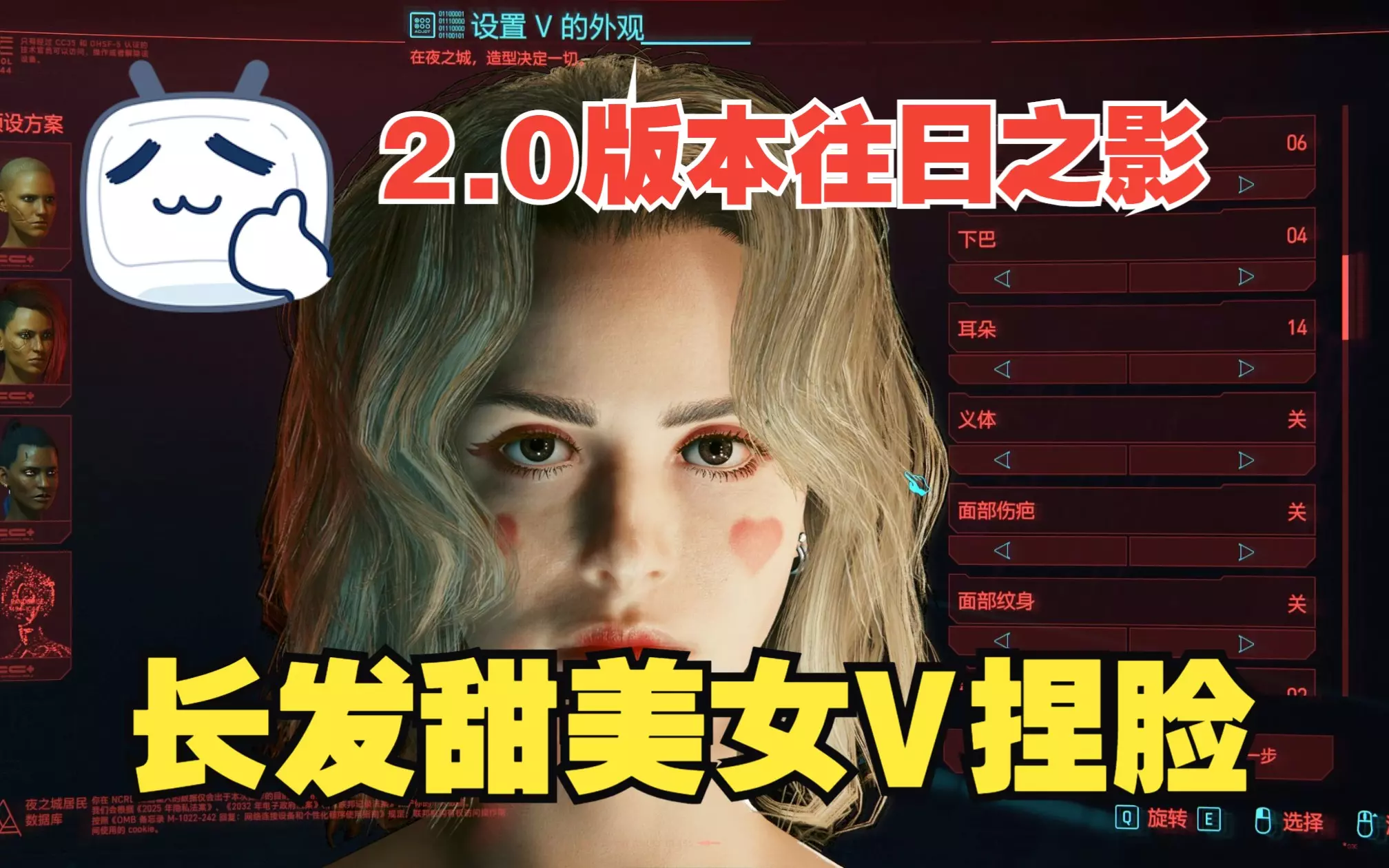 长发甜美女V捏脸-2.0版本往日之影-赛博朋克2077 数据; 肤色:第一排第二个 皮肤类型:04 发型:12 发色:第二排第二个 眼睛:12 眼睛颜色:第一排…