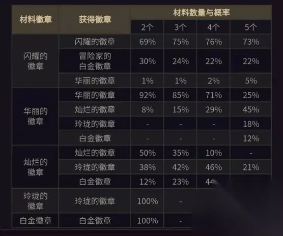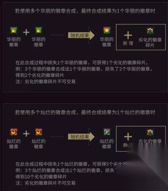 2、合成徽章会让徽章的等级和效果改变。 3、想要合成华丽以下等级的徽章,直接放入五个低等级的合成即可。