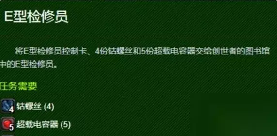 2、 启动收集任务:右键点击控制卡,启动“e型检修员”任务。准备4螺丝钉和5超载电容器(拍卖行购买)。
